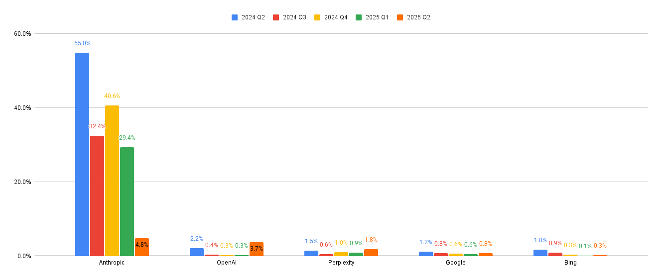 - Anthropic: Anthropic had a 55% 404 rate in Q2 2024. To put that in perspective, imagine if more than half of all the links you clicked led to an error page. This year in Q2 it had improved to a 4.8% 404 rate. The timing of this improvement corresponds with Claude, Anthropic’s chatbot , being given access to the real-time web, allowing it to retrieve and cite live URLs rather than relying on extrapolations from training data.