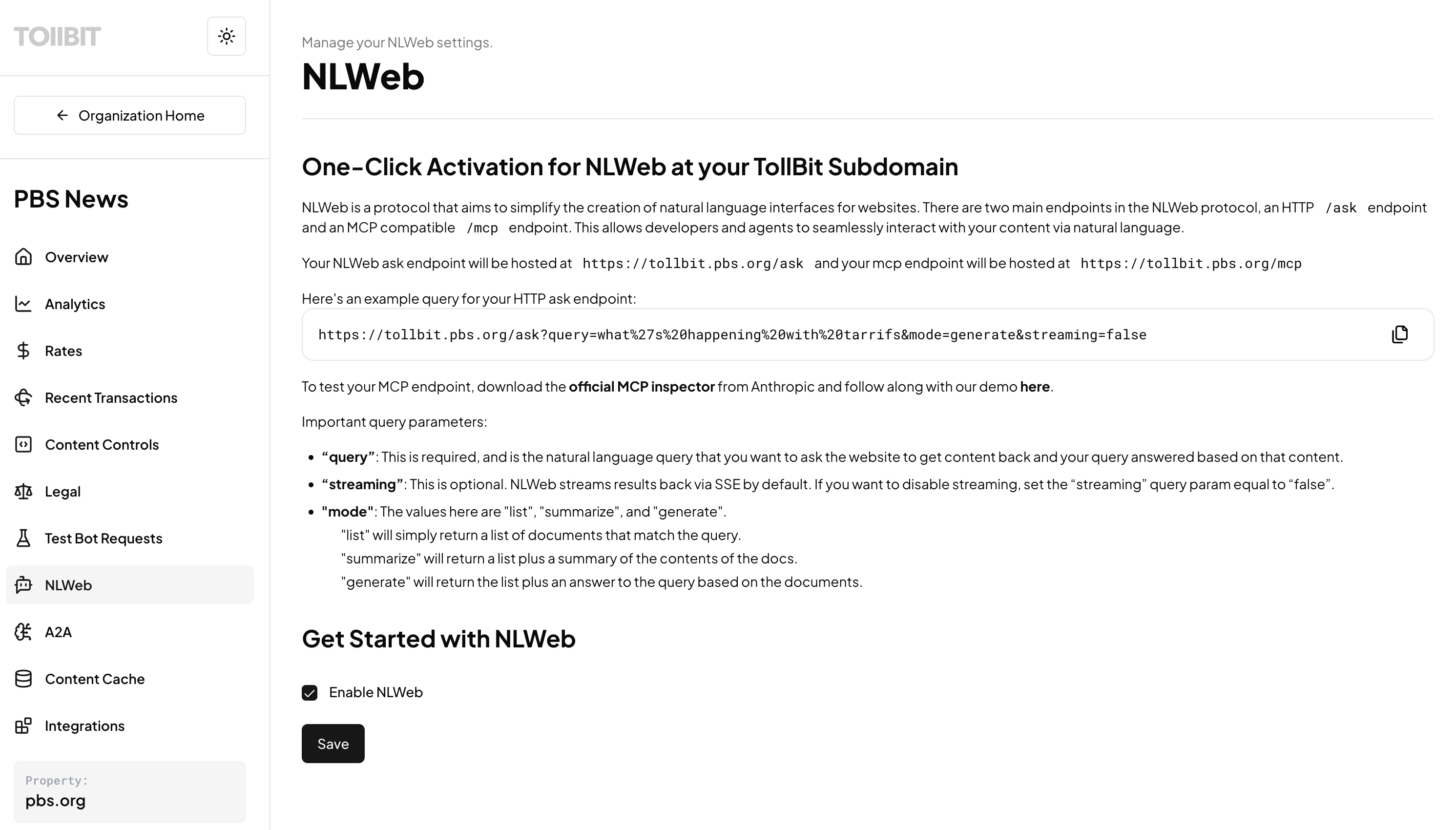 Screenshot of how to enable NLWeb from your TollBit Dashboard.